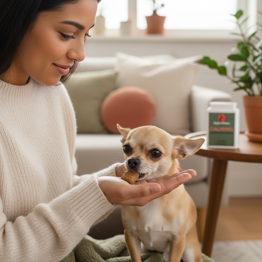 No more wrestling! our delicious chicken-flavored supplements make calming your pup simple.